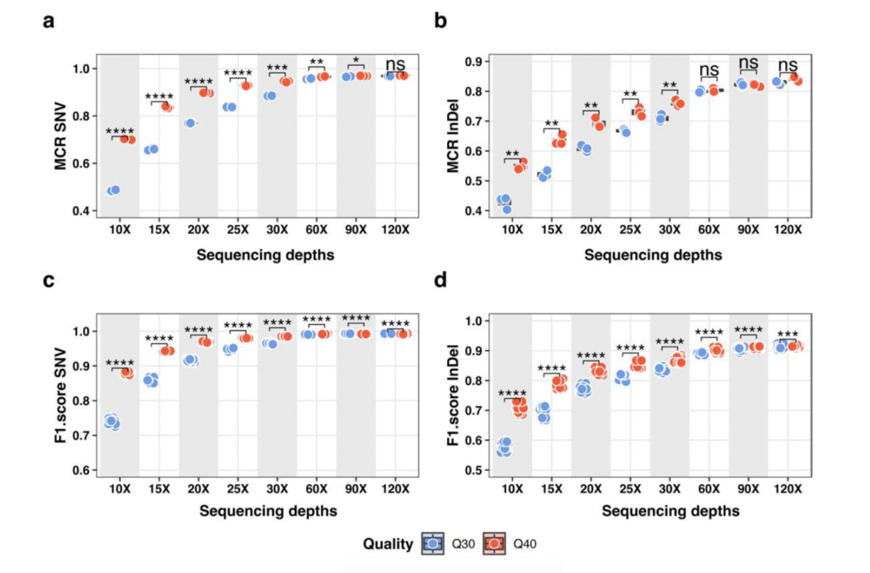 Germline SNV and InDel calling performance (Q30 vs Q40)