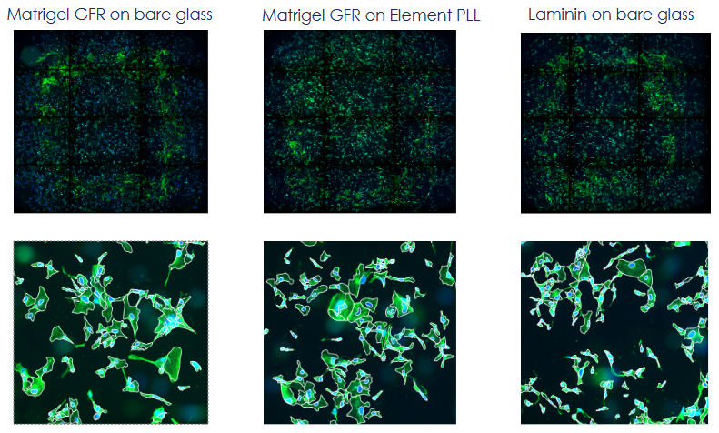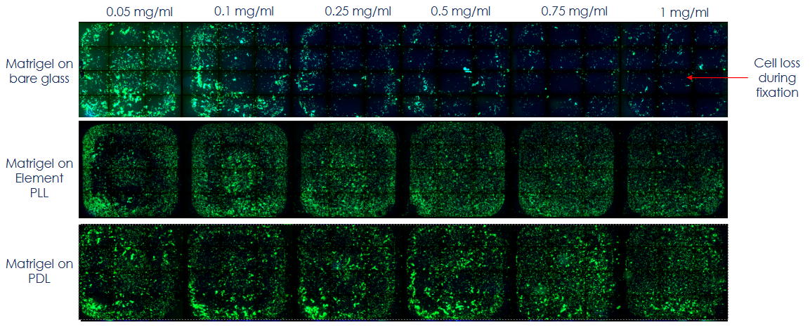 Other coatings including Matrigel Growth Factor Reduced (GFR) on Element PLL, Matrigel Growth Factor Reduced (GFR) on Element’s glass slide kit, Laminin on Element’s glass slide kit, and Matrigel and Laminin plus 0.01% PDL on Element’s glass slide kit were also tested with similar efficacy. Please see the concentration table in the Summary of Recommendations section below for recommendations when using any of these coatings.